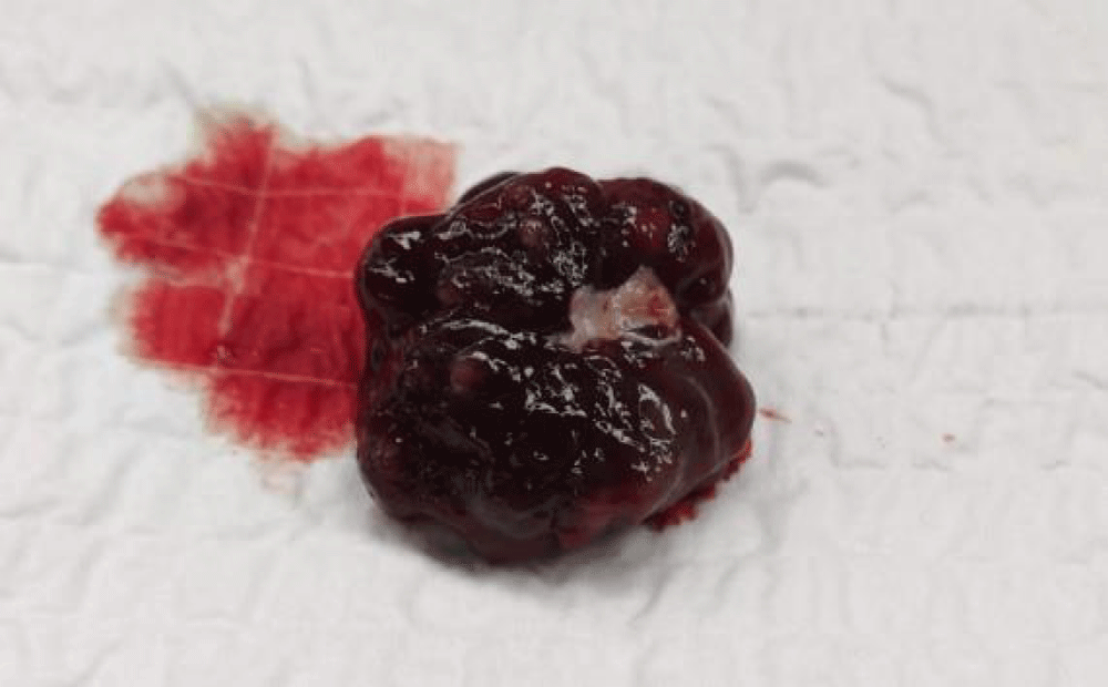 In the 2021, the annual total body CT showed a mass about of 2.5 cm near the junction between inferior vena cava and the right atrium. The mass appeared as intracavitary filling defects with heterogeneous contrast enhancement. The neoplastic history of the patient suggested a tumoral nature of the mass, but we couldn't exclude that was a thrombus. A trans-thoracic (Figures 1,2) and a trans-esophageal (Figure 3) echocardiograms showed a very mobile pedicle right atrial mass about of 3 cm of diameter and its relationship with the Eustachian valve, tricuspid valve and inferior vena cava's orifice. We would have liked to perform a cardiac Magnetic Resonance (MR), but the patient refused because she suffered from claustrophobia. Surgical indication was given to remove the right intra-atrial mass; especially for the high risk of emobolization. A median sternotomy was performed. Cardiopulmonary bypass was initiated with distal ascending aorta cannulation and bicaval venous cannulation. The tumor appeared to arise from the fossa ovalis near to the orifice of the inferior vena cava. The mass and the part of atrial septum infiltrated were completely removed. We preferred to close the surgical defect with a direct running suture as the size of the septal aneurysm allowed for it. The histological examination confirmed the diagnosis of cardiac myxoma (Figure 4). The patients were discharged from hospital without any problems after one week.