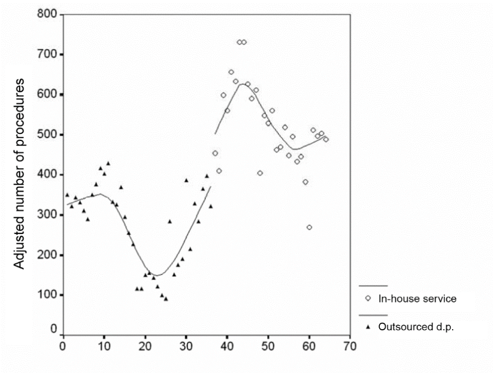 In table 4, it can be observed that the in-house service was able to reduce costs by 36% and yet there was an increase of over 30% in the total number of procedures, which means that the cost per procedure was reduced by more than half. One major reason for the reduction in cost was the removal of the outsourced dental plan profit component. Although the system of hired dentists is commonly accused of being less productive [27], there was no reduction in the total number of procedures with the in-house service.