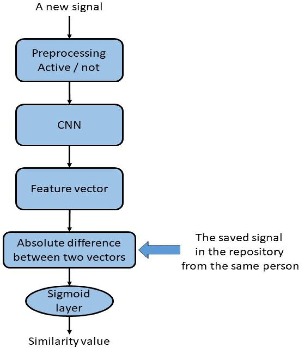Registration in the authentication system requires storing one sample from each certificated user in the system repository. To this end, after applying preprocessing step, extracted vector by the CNN part will be saved for the next comparison. For this reason, there is no need to change the model and train it again for adding and registering a new user in the system. To this end, storing the sample with the indicated conditions will be sufficient.