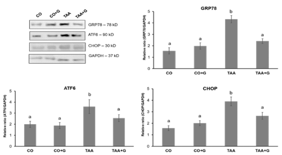 Concerning markers of ER stress, analysis of ATF6 transcription factor and CHOP and GRP78 proteins expression showed a significant increase in the TAA group in rela-tion to the CO and CO+G groups and a significant decrease in the TAA+G group (Figure 3).