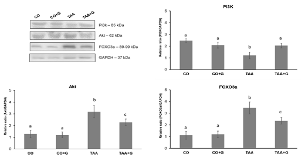 Several molecules are mediators in cell signaling pathways and activate different cascades that culminate in the most diverse mechanisms within the cell. Figure 6 shows the results of the evaluation of PI3K, Akt and FOXO3a proteins expression. PI3K expres-sion decreased in the TAA group as compared to controls and increased in the Gln-treated group. Akt and FOXO3a proteins, that participate in the activation of the apoptosis cas-cade, increased in the TAA group and decreased in the TAA+G group as compared to the TAA group.