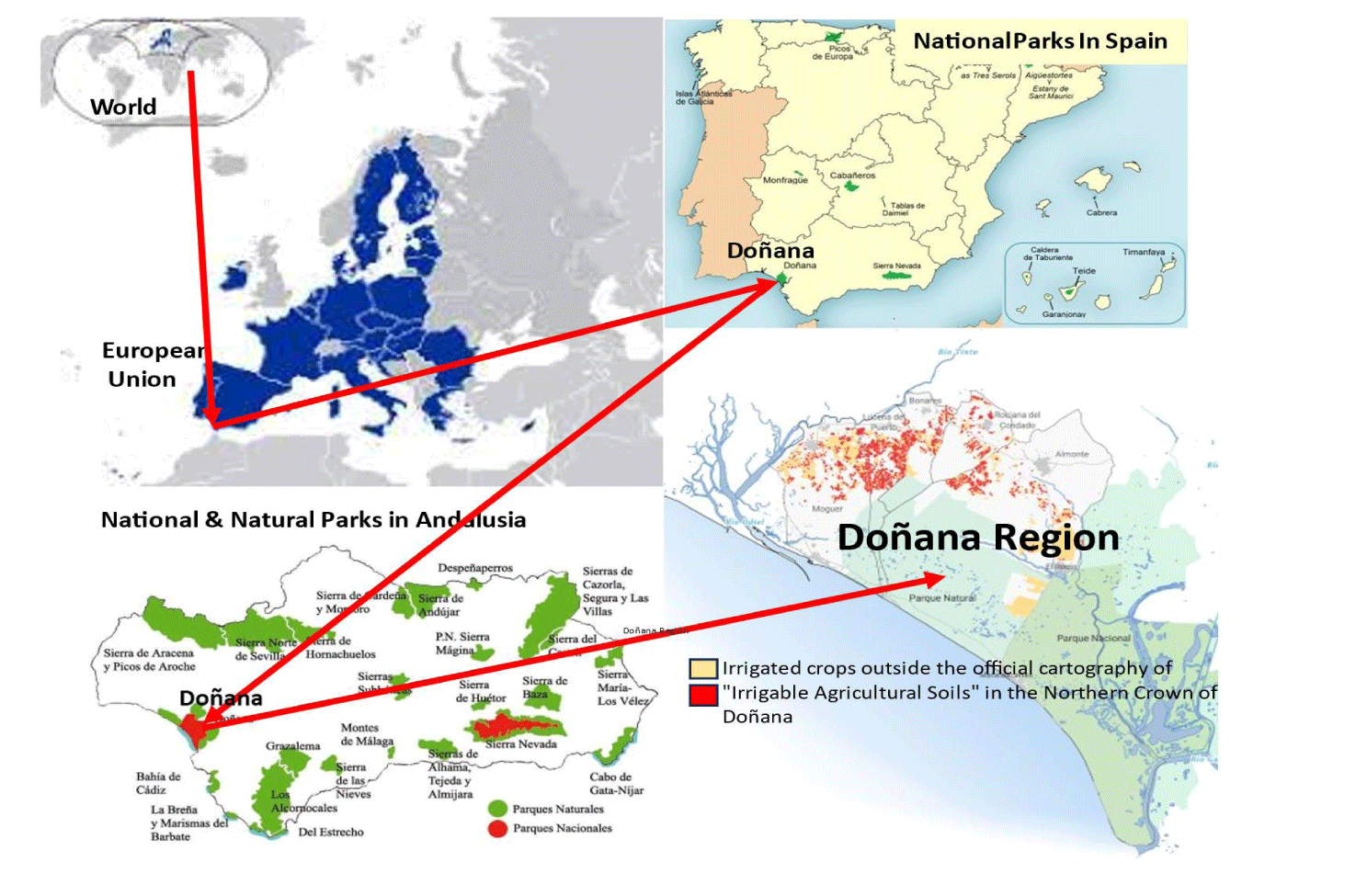 The Doñana region covers 290,600 hectares, of which 255,000 have been designated as a UNESCO World Heritage Biosphere Reserve, as well as a Ramsar wetland. Its exceptional location, between Europe and Africa, and between the Atlantic Ocean and the Mediterranean Sea, makes it the largest ecological reserve in Europe. Despite this, it has not been spared from conflict because prolonged drought has endangered the natural ecosystem and economic development (Figure 1).