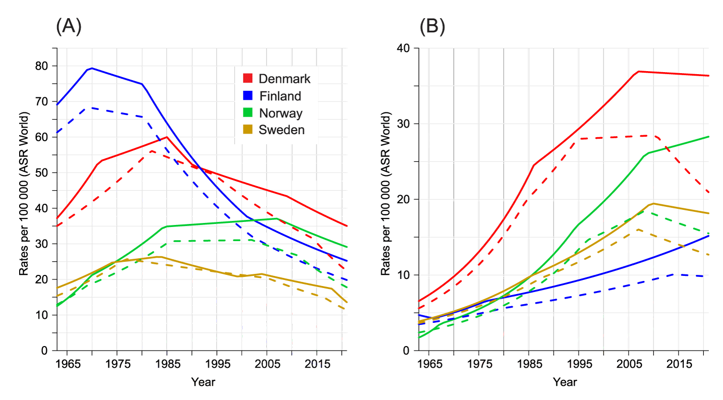 Age-standardized (world) male and female incidence and mortality trends for LC for period 1963 to 2021 are described in figure 1. Male peak incidence rates were highest for FI at 80/100,000 and lowest for SE at 25/100,000 (Figure 1A). The peak incidence was in 1970 in FI, in 1985 in DK and in 2007 in SE and NO. Mortality rates followed the incidence rates at a lower level. The female incidence rate was by far the highest for DK, reaching a peak of 37/100,000 in 2007 (Figure 1B). The NO incidence rate climbed until 2021, reaching 28/100,000. The lowest but still increasing incidence of 15/100,000 was for FI women in 2021.