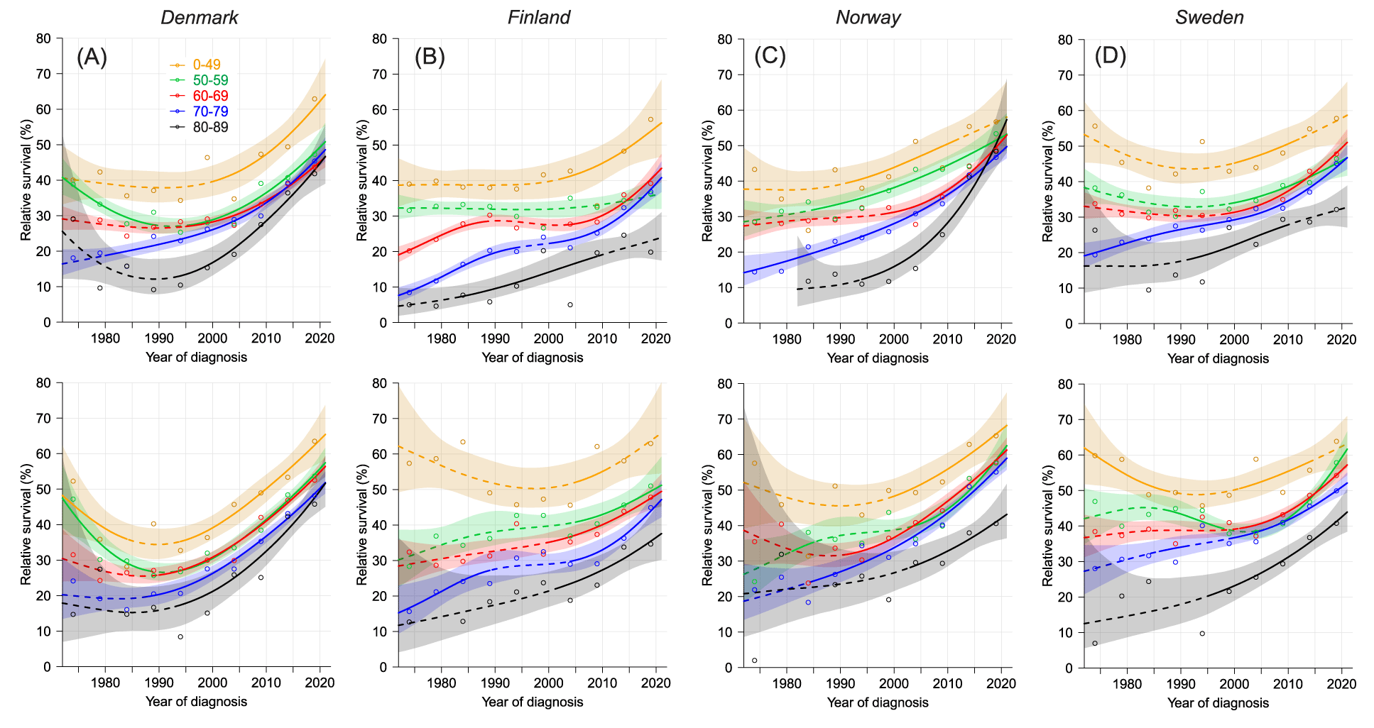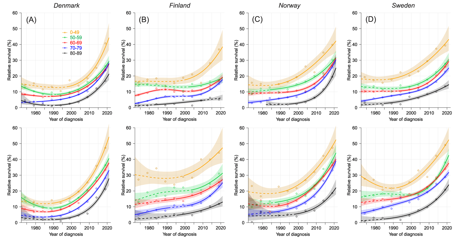 Results: Very little improvement was found in survival for any age group before year 2000. By 2017-21, 5-year survival for men below age 50 years has increased to over 40% (FI somewhat less) and for equally aged women it was over 50% in countries other than FI. Survival reached over 20% for the 80-89-year-old male and female patients but it was 7% for men and 12% for women in FI. DK age-group-specific survival curves stayed well parallel to each other indicating equal improvement but for FI and SE men the curves diverged showing increasing age gaps. Nordic age-specific survival data were better than those in the US SEERS