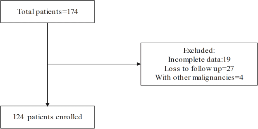 A total of 174 patients undergoing NACT were screened. Among them, 27 patients were lost to follow-up, 4 patients had other concurrent malignancies, and 19 patients had incomplete clinical data. Ultimately, 124 patients were included in the study (Figure 1).