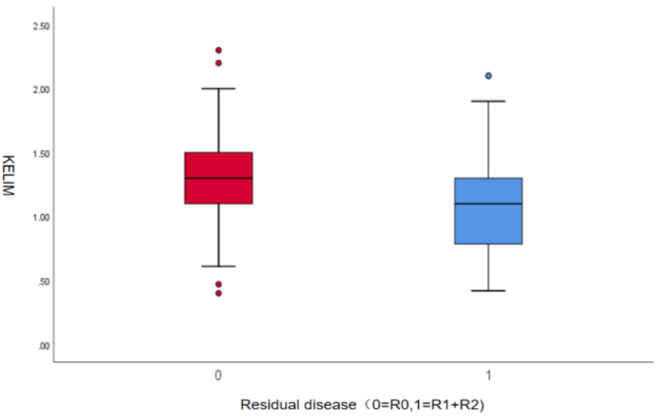 There were no statistically significant differences in age, BMI, menstrual status, family history of cancer, baseline CA125 levels, lymph node metastasis, BRCA mutation status, surgical approach, number of Neoadjuvant Chemotherapy (NACT) cycles, maintenance therapy with PARP inhibitors, maintenance therapy with bevacizumab, platinum-free interval, or mortality between patients with R0 cytoreduction and those with non-R0 cytoreduction (p > 0.05). However, it is noteworthy that the proportion of platinum-resistant patients was significantly lower in the R0 group compared to the non-R0 group [6 (11.3%) vs. 17 (23.9%)]. There were statistically significant differences in FIGO stage, baseline HE4 levels, recurrence, and KELIM scores between the R0 and non-R0 groups (p < 0.05). In the non-R0 group, patients had a lower average KELIM score of 1.076, while patients who underwent complete cytoreductive surgery had a higher average KELIM score of 1.324 (p = 0.001, table 1). The distribution of KELIM scores between the two groups is shown in a box plot (Figure 2).