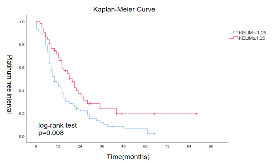 When plotting the curve between KELIM and Platinum-Free Interval (PFI), it was found that patients with a higher KELIM score also had a significantly longer PFI compared to those with a lower KELIM score. The mean PFI for the KELIM <1.25 group was 16 months, while the mean PFI for the KELIM ≥ 1.25 group was 30 months. The difference between the two groups was statistically significant (X²=7.053, p = 0.008) (Figure 6).