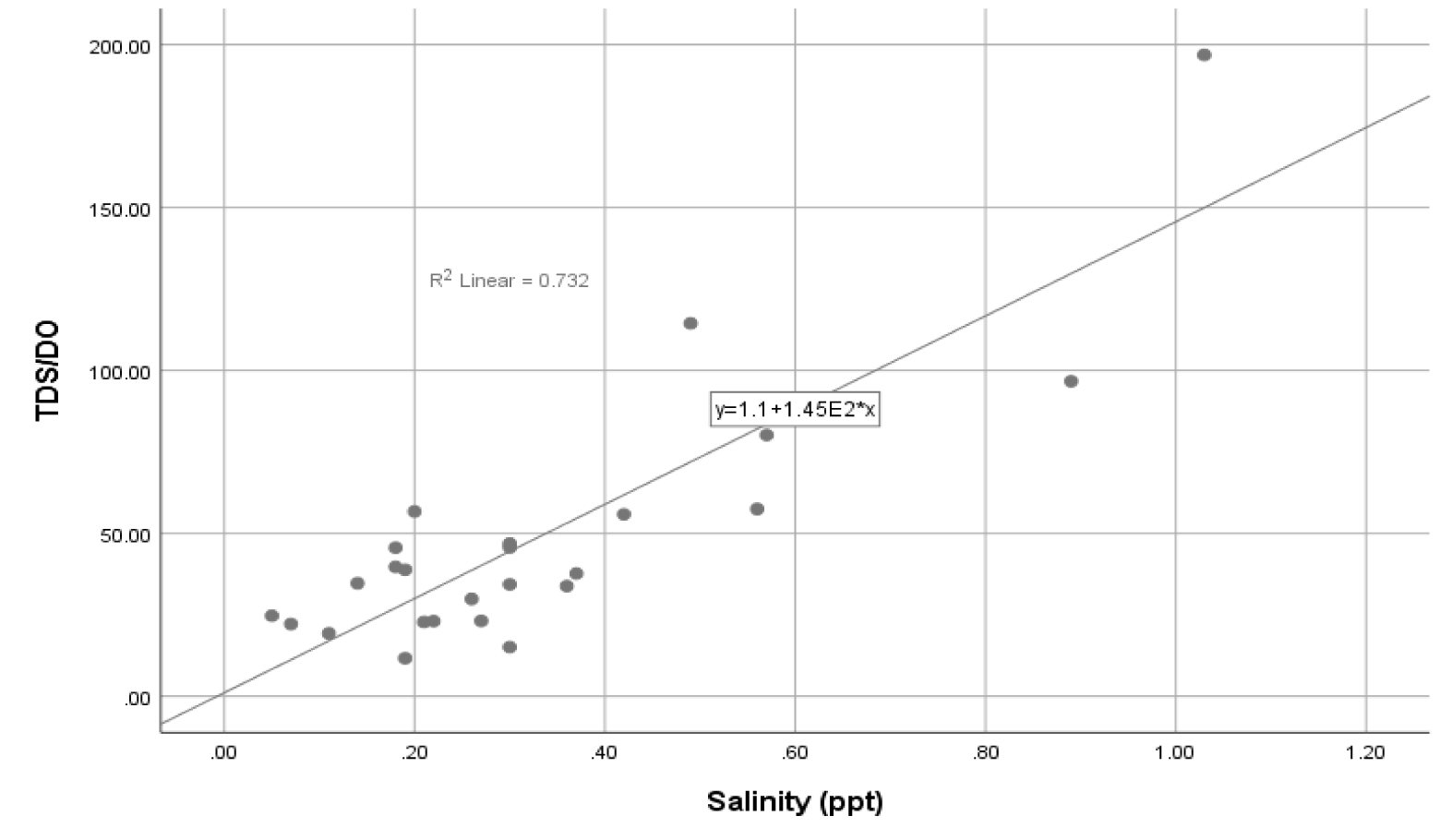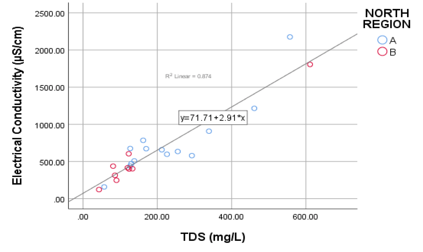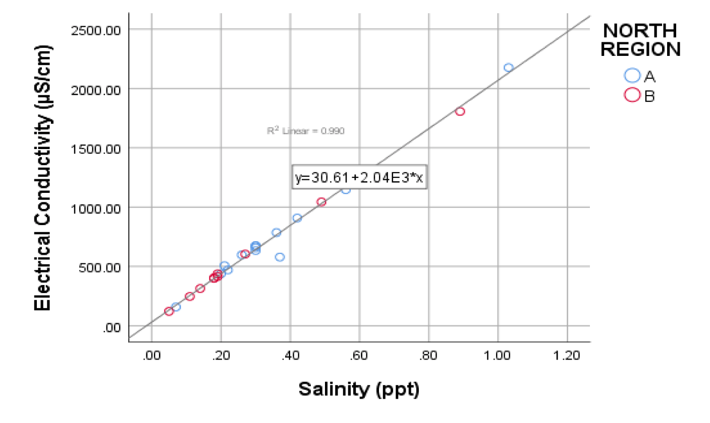 The EC values were found to show a strong positive correlation with TDS values (Figure 1; r2 = 0.874), similarly, EC and salinity showed a strong correlation (Figure 2; r2 = 0.99). These correlations depicts that, while one parameter increases another parameter increases as well. As a very remarkable observation, the TDS/DO showed a strong correlation with salinity (Figure 3; r2 = 0.732).