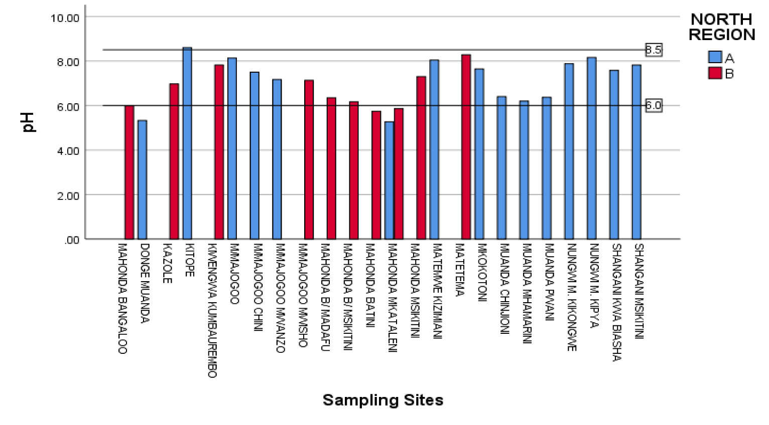 In May 2018, twenty five groundwater samples were collected from different sites of North Region of Zanzibar namely North district A and North district B. These samples included open hand dug wells and closed hand dug wells. Samples were collected in pre-cleaned polyethylene bottles. The sampling and handling of the samples were done in accordance with the standard EPA method 2007.