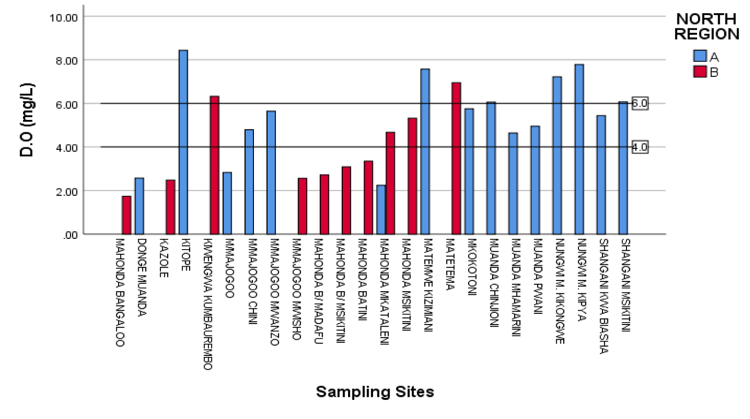 | D.O (mg/L) | 25 | 6.69 | 1.74 | 8.43 | 4.8472 | 1.96 |