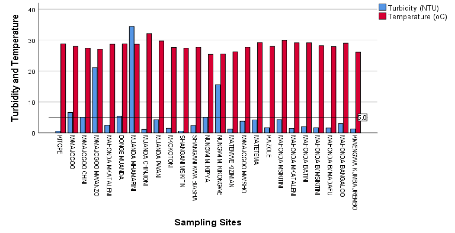 16% of the water samples had DO values which are within the acceptable range. 4% of the water samples had DO values which are above the acceptable range. 80% of the water samples had DO values which are below the acceptable range. For the parameter of turbidity, 40% of water samples had turbidity values within the acceptable range. 56 % of the water samples had pH values which are within the acceptable range. Where by Kitope water sample showed highest pH value (8.60), while Mahonda Mkataleni was found to have the smallest pH value (5.27). It is worthy to mention that sampling sites at Mahonda region had low pH values. The possible reason for the observed low values in pH in this region could be attributed by seepage of some chemicals from Mahonda Sugar Industry into ground water reservoirs [9].