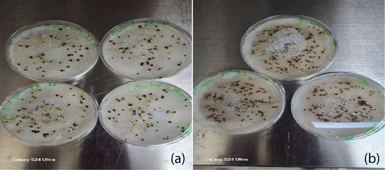 Seed pretreatment process: Mustard (Brassica nigra) and carom seeds (Trachyspermum ammi) were procured from local market of Ras Al Khaimah. Washing with 70% alcohol and then three times with sterile distilled water and dried on 70 mm Whatman filter paper at room temperature disinfected the seeds. These dried seeds were distributed into 90 mm petri plates with different quantities of seeds per plate and treated with 1ml of appropriate concentrations of pure culture of bacteria inoculum (Bacillus subtilis and Pseudomonas sp.). Three replicates per treatment were taken and incubation for 24 h at room temperature in laminar air flow with closed petri plates. After the incubation period, bacterial inoculum was removed, and the seeds were kept for drying on 70 mm Whatman filter paper at room temperature. Seeds without any treatment as well as 0% treatment (only distilled water) served as a control for the seed treatment process. The dried seeds were transferred to a Petri plate containing a layer of sterilized cotton covered with sterile filter paper with the pore size equivalent to Whatman Grade 3 and moistened with 5 mL of sterile distilled water for germination and placed in environmental conditions with a temperature of 22-25ºC day/ 14-18ºC night. Observations were made 4 and 7 days after inoculation without uncovering the boxes, and a visible radicle length of at least 2mm was the criterion for germination [17]. The germination percentage (G%) was determined according to [18]. At 20 days, the length of shoot and the root were measured in each seedling.