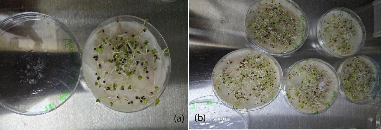Determination of seed germination rate: The ability of a seed to germinate uniformly and rapidly at different environmental conditions is an essential characteristic required for most of the plants, including mustard and carom. Germination percentage gives the viability of the number of seeds germinated per treatment. The average percentage of seed germination in mustard is 40-67% figure 2a for an incubation period of 4-5 days (Table 1). Additionally, in case of carom seeds, the germination rate is 82-90% (Figure 2b).