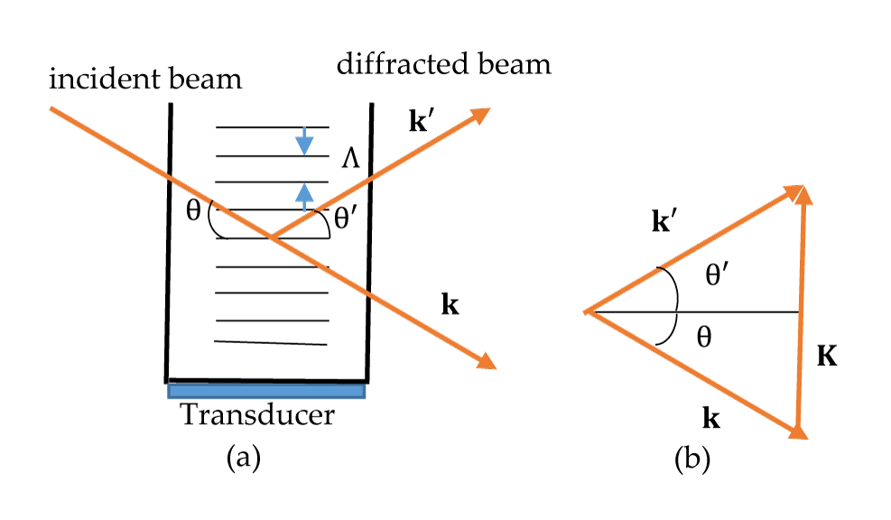 where K, k', and are the wave vectors of the sound wave, diffracted beam, and incident beam, respectively, while θ and θ' are the incident and diffracted angles, respectively. Here, vs is the sound velocity, fs is the frequency of the sound wave or the modulation frequency, Λ is the wavelength of sound, and λ is the wavelength of the beam in the medium. If the frequency of the incident beam is f = f0, then the Doppler effect causes the frequency of the diffracted beam to be f' = f0 - fs, where the beam is the +1st-order beam. Eq. (2) represents the Bragg condition.