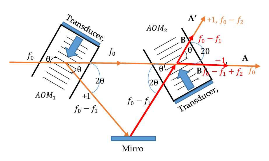 The basic optical setup of the heterodyne light source is shown in figure 2 to further illustrate the principle of the coincidence of the two beams produced by the two AOMs connected in series. Here the modulation frequencies of AOM1 and AOM2 are f1 and f2, respectively. Under Bragg diffraction conditions, if the optical frequency of the laser light is f0, then the optical frequency of the 0th-order beam from AOM1 is unchanged at f0, while the optical frequency of the +1st-order beam is f0 − f1. The angle between these two beams is 2θ. The 0th-order beam from AOM1 is incident on the second AOM (AOM2). The optical frequency of the direct beam remains unchanged at f0 which is denoted as beam A, while the optical frequency of the +1st-order beam is f0 − f2 and is denoted as beam A'. The angle between these two beams is 2θ. In addition, the diffracted light with a frequency of f0 − f1 is reflected into AOM2 after passing through mirror M. The direct light frequency remains f0 − f1, denoted as beam B, and its −1st-order beam has a frequency of f0 − f1 + f2, denoted as beam B'. By fine-tuning the angle of mirror M so that the angle of incidence is θ (that is, the angle between the 0th-order beams is 2θ), the two sets of beams can coincide. One set consists of beam A' coincident with beam B, while the other set consists of beam A coincident with beam B'. The frequency difference between the two beams in both sets is f = | f2 - f1 |.
