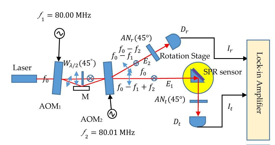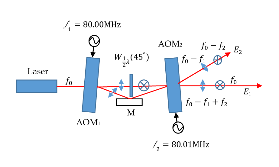 As illustrated in figure 3, the proposed heterodyne light source consists of a laser, two AOMs (AOM1, AOM2), a Mirror (M), and a half-wave plate Wλ⁄2 (45°) positioned at an azimuth angle of 45°.