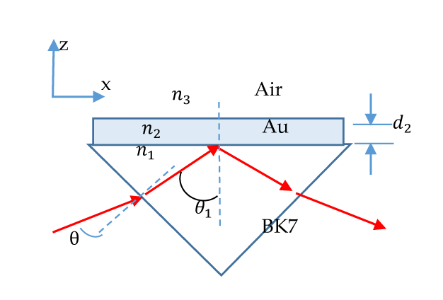 As illustrated in figure 6, the refractive indices of the prism (BK7), Au, and air are denoted by n1, n2 and n3, respectively.
