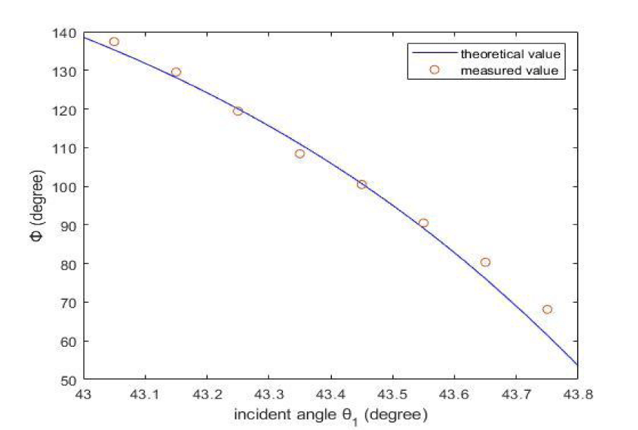 By rotating the SPR sensor counterclockwise near the resonance angle (from 43o to 48o), the phase-shift difference ϕ and the angle of incidence θ1 were recorded. The experimental data, denoted by red circles, are shown in figure 7, alongside simulation results (solid line) generated using MATLAB. The optimal gold-film thickness obtained from the experiment was 35 nm, which is in good agreement with the actual gold-film thickness of the SPR sensor.