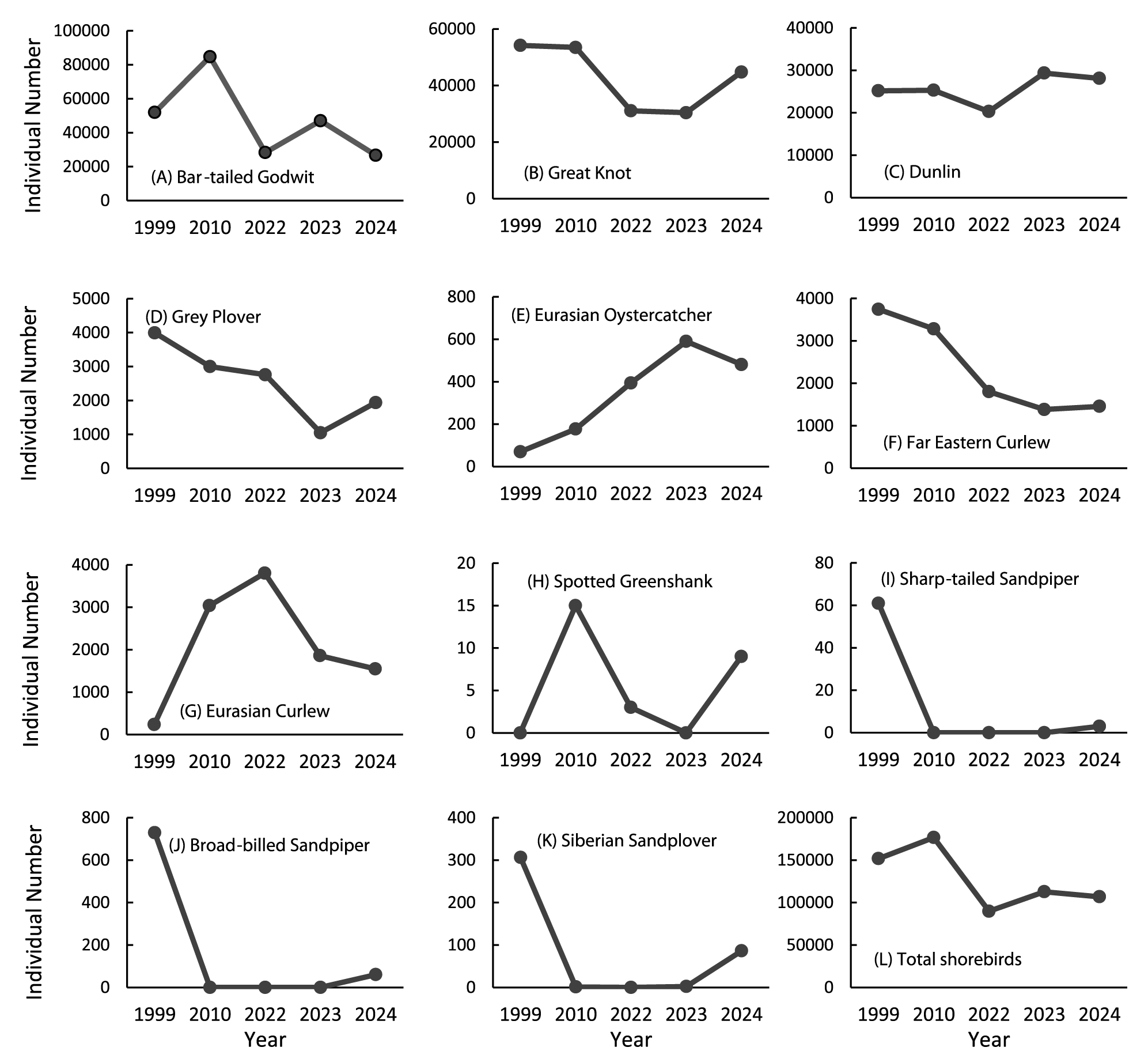 During our study period from 2022 to 2024, the number of shorebird species and total counts remained stable (Table 1). In comparison with the survey results in 1999 and 2010, the number of shorebird species was similar, ranging from 19 to 24 species, compared to 25 species in 1999 and 21 species in 2010. However, the total individual counts declined by about 30-40% compared to the 1999 survey, and declined by about 40-50% compared to the 2010 survey.