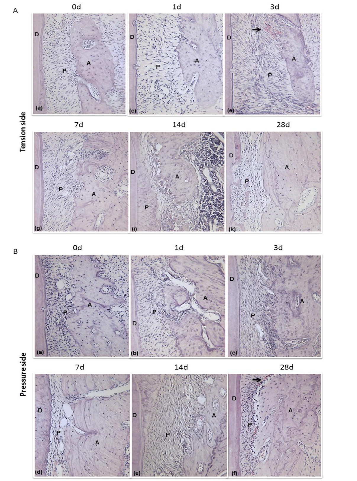 Light micrographs of PDL (Periodontal Ligament) tissue on the tension site (A) and pressure site (B) in rat on days 0, 1, 3, 7, 14 and 28 after tooth movement. (A: Alveolar; P: Periodontal ligament; D: Dentin; Arrowheads: Artery; Magnification, 200×).