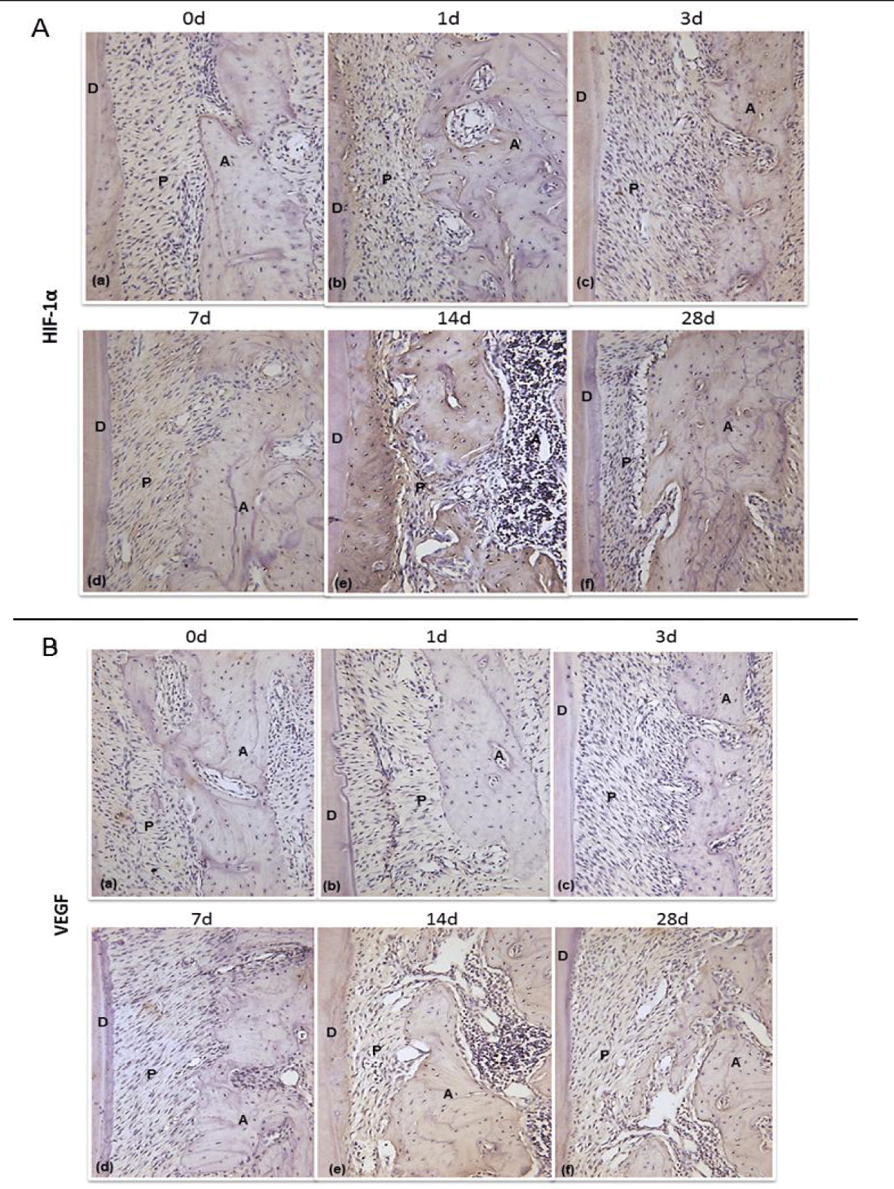 Immunohischemistry results of HIF-1α and VEGF on the surface of the alveolar bone tension surface side at days 0, 1, 3, 7, 14 and 28 after the start of tooth movement. (A: Alveolar; P: Periodontal ligament; D: Dentin; Magnification, 200×) figure 4.