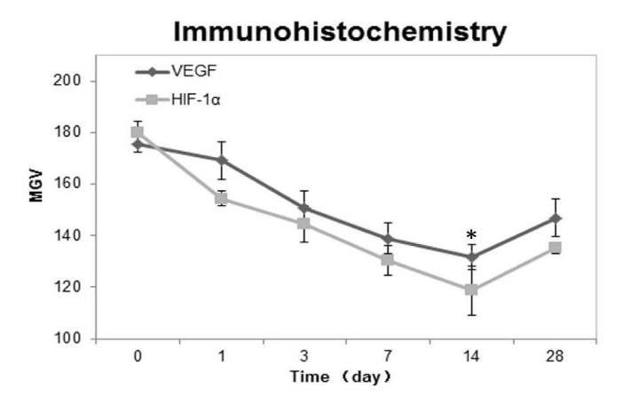 HIF-1α and VEGF protein expression both in PDL tension site and pressure site was investigated using immunohistochemical analysis. On the 1st day after the beginning of tooth movement, several HIF-1α and VEGF positive cells were observed on the surfaces of the alveolar bone. On the 3rd, 7th, and 14th days, more and more HIF-1α and VEGF protein appeared on the tension site. The expression of HIF-1a and VEGF in the PDL during the whole experiment was peaked at 14th day group. Compared with control groups (p < 0.05), experimental groups expressed significantly moreHIF-1α and VEGF protein on the surface of the alveolar bone tension surface side during the rat tooth movement (Figures 3A,B). Immunohistochemical analysis revealed the same changing tendency of HIF-1α and VEGF on the alveolar bone. The MGV (Mean Gray Value) of HIF-1α positive cells was lower than that of the VEGF positive cells. This finding indicated that HIF-1α was expressed to a higher level than VEGF (white = 255, black = 0). 28 days after the initiation of the tooth movement, the regenerated bone with HIF-1α and VEGF positive cells was recognized on the surface of the alveolar bone at tension side. In our quantitative evaluation, the MGV of HIF-1α and VEGF positive cells was significantly decreased on the 1st, 3rd, 7th and 14th days and reached nadir on the 14th days, and then increased on the 28th day (Figure 4). It indicated that difference was statistically significant. (Figures 3A,B)