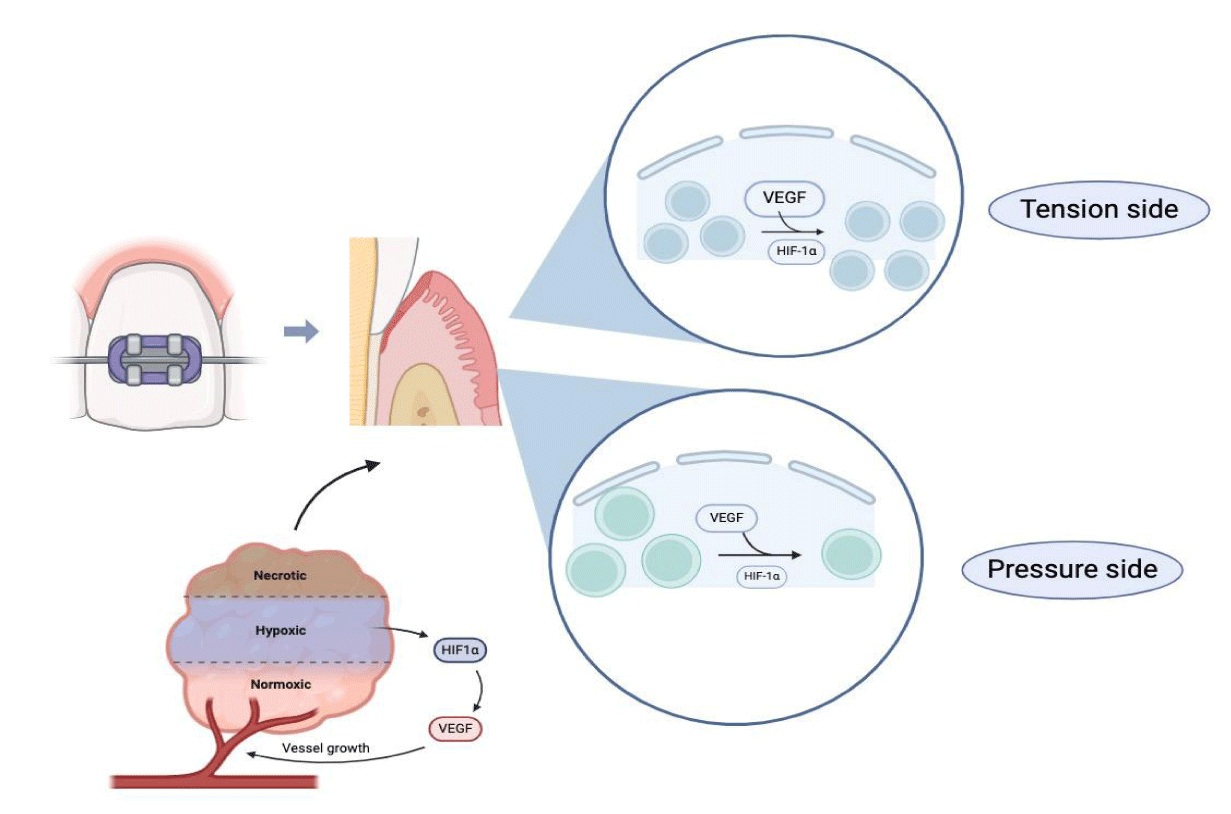 In summary, we can conclude that tooth movement leads to changes in pulp tissue and is accompanied by an inflammatory process. Mechanical force can enhance the expression of HIF-1α and VEGF, indicating that HIF-1α and VEGF may play an important role in maintaining pulp homeostasis during orthodontic movements. HIF-1α may become a global mediator of hypoxic angiogenesis response by inducing various angiogenic factors, including VEGF.