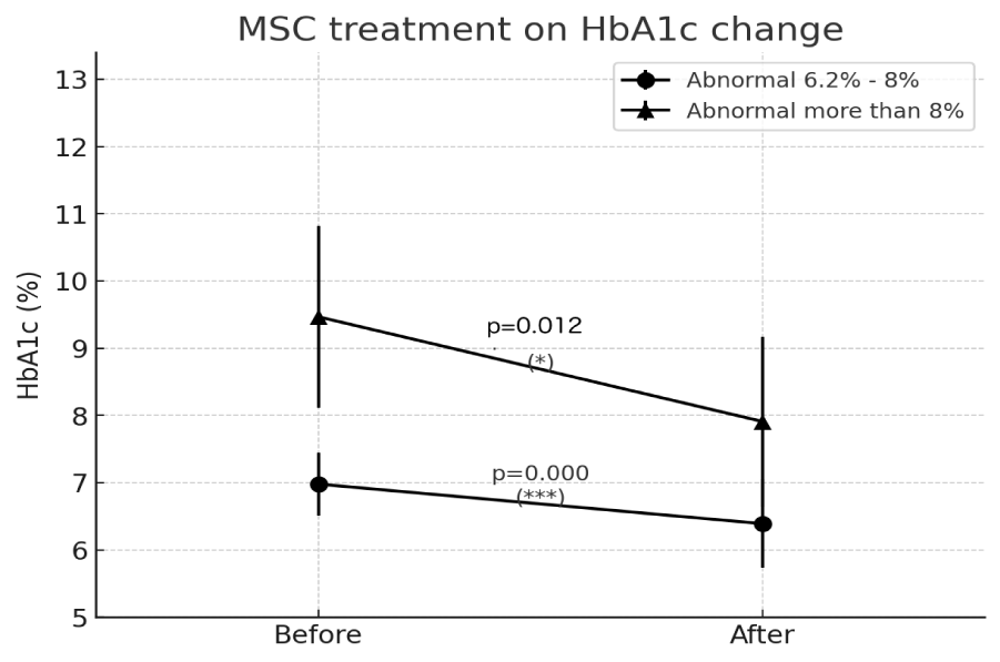 Diabetes mellitus remains a global health challenge, with HbA1c levels serving as a critical marker for long-term glycemic control. Conventional treatments, including insulin and oral hypoglycemic agents, often require lifelong management and do not address the underlying disease pathology. MSC therapy, with its potential immunomodulatory and regenerative effects, has shown promise in preclinical and clinical studies [1]. Studies, including those referenced in the reference [2], indicate that MSCs can modulate immune responses, reduce inflammation, and enhance beta-cell function, thereby improving glycemic control.