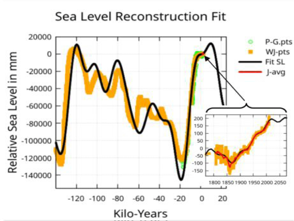 The objective is to show that the known features of global average sea-level can be accounted for by eleven periodic functions associated with planetary orbits – the hypothesis. The method will be to show that proxy data for relative sea-level during the last glacial cycle and a modern sea-level reconstruction are fit accurately using these periodic functions. The modern sea-level reconstruction has errors measured in millimeters while the proxy data errors are measured in tens of meters. (Figure 1) gives an early look at the fit.