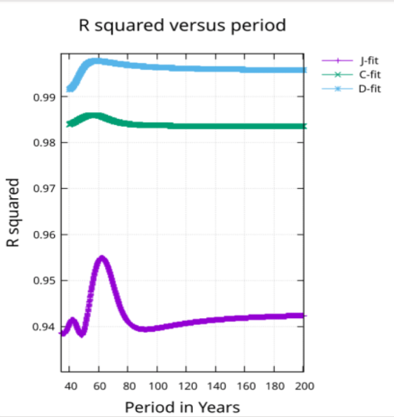 As shown in figure 2, a scan through fits using different periods show a peak in R squared at periods near 60 years. The peak is most obvious for the J-fit and least obvious for the D-fit.