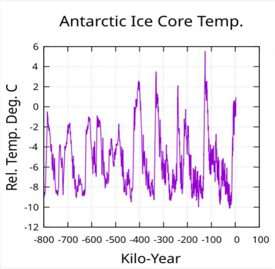 Now consider Figure 3 which shows 800,000 years of proxy Antarctic ice core data determining approximate relative temperature. There is an obvious change in maximum temperature of interglacials before and after -450 ky even though the interval between temperature peaks is roughly the same. This suggests that something, in additional to planetary orbital periods, is modulating the temperature without an obvious periodic association - something that varies on a time scale of several hundred thousand years that is weaker than orbital drivers and possibly random.