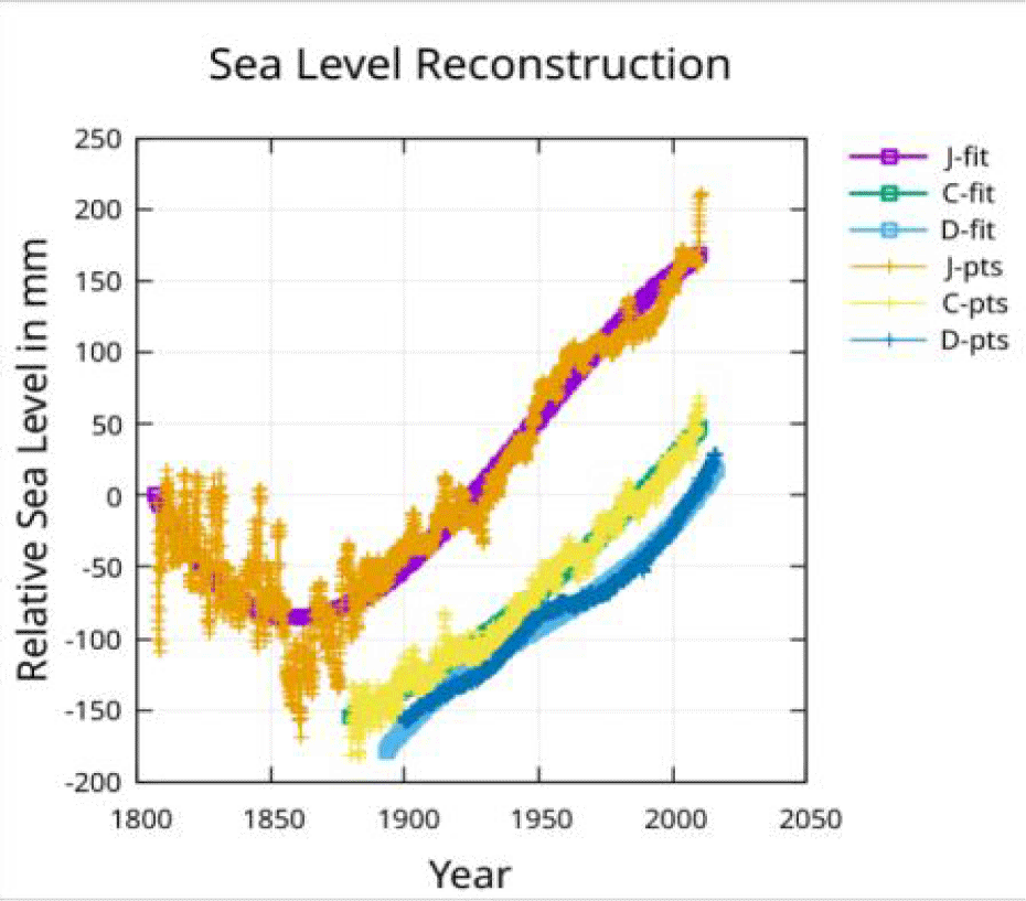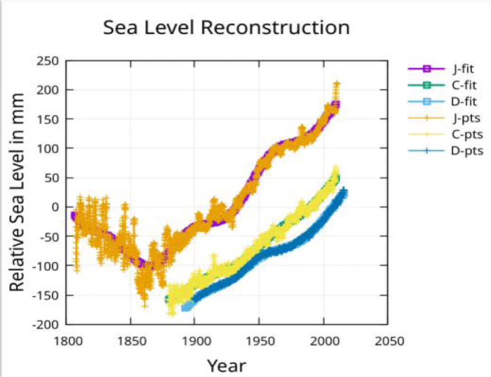 For brevity the Jevrejeva S, et al. [1]. reconstruction data points will be referred to as the J-pts and a fit to the reconstruction will be referred to as a J-fit. Similarly, the Church and White [2] reconstruction data points will be referred to as the C-pts while a fit to the reconstruction will be referred to as a C-fit. The Dangendorf, et al. [3] reconstruction data points will be referred to as the D-pts while a fit to the reconstruction will be referred to as a D-fit.