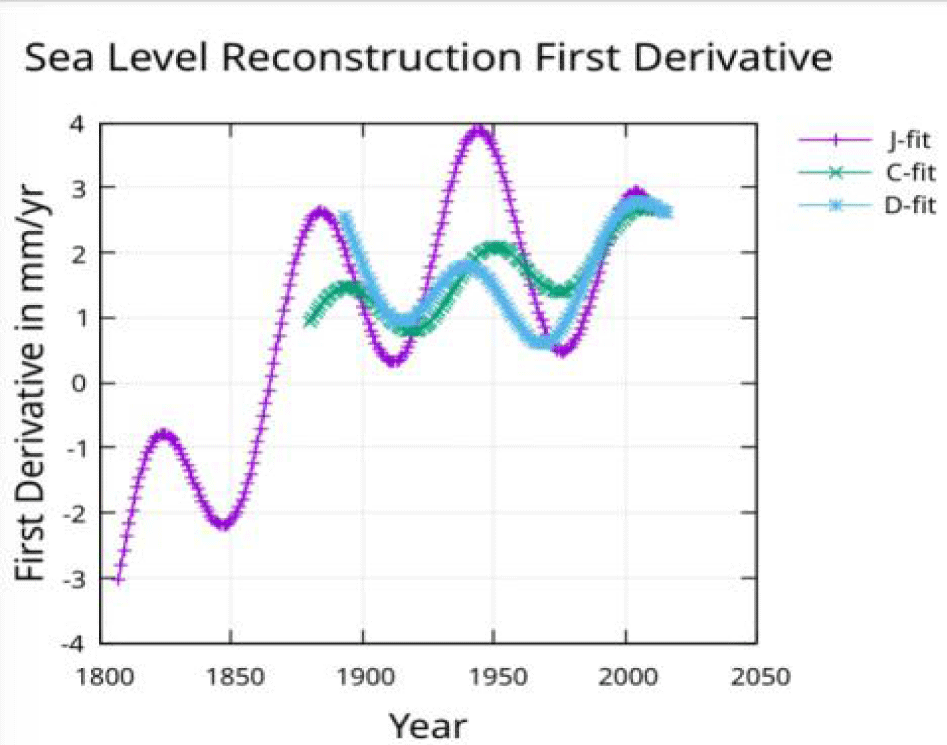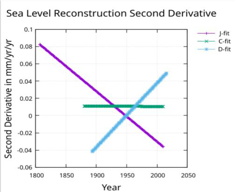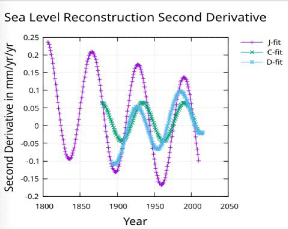 The acceleration measured by Church and White is constant and agrees with the acceleration shown in figure 8 for the C-fit. The acceleration found by Dangendorf, et al. [3] is 0.09 mm/yr/yr from a quadratic fit which will only provide a constant value. Figure 9 shows an acceleration that is negative (about -0.04) in 1900 but increasing and reaching zero in about 1950 and continuing to increase to about 0.05 by 2010. The acceleration for the fit to the Jevrejeva, et al. [1] reconstruction after removing the 60-year modulation, is decreasing to zero around 1950 and continuing to decrease to about -0.035 mm/yr/yr by 2010. The acceleration at the midpoint of the J-fit line in figure 9 is about 0.02 mm/yr/yr which agrees with the acceleration found with a quadratic fit by Jevrejeva S, et al. [1].