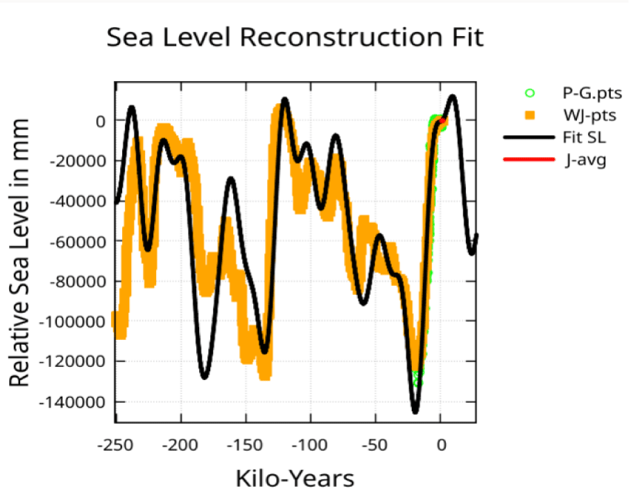 Options: If no weighting is applied (weight 1.0 for all points) and the J-pts data is part of the input, the fit R squared is 0.866 from -250 ky to +2 ky (up from 0.574). However, the fit finds sea-level for the year 2000 to be 11.7 meters below the 1930 level and falling. So weighing data corresponding to the far past the same as the near past improves the far past fit at the expense of large errors in the near past and present. This is especially true for the modern sea-level reconstructions since the year 1800, which are 1000 to 10,000 times more accurate. This supports: (1) the assumption of an unknown weak long term base temperature variation producing a corresponding long term base sea-level variation or (2) increasing error in the sea-level information as the date moves farther into the past or (3) possibly both.