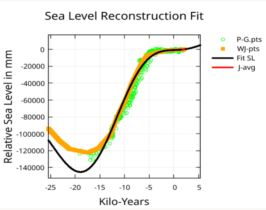 Additional points from figures of Physical Geology [11] (Appendix) were digitized for the last 21,000 years (P-G-pts). The P-G-pts were not used in the fit but are plotted with the fit in some figures for comparison.