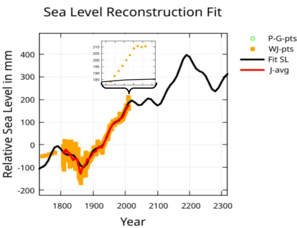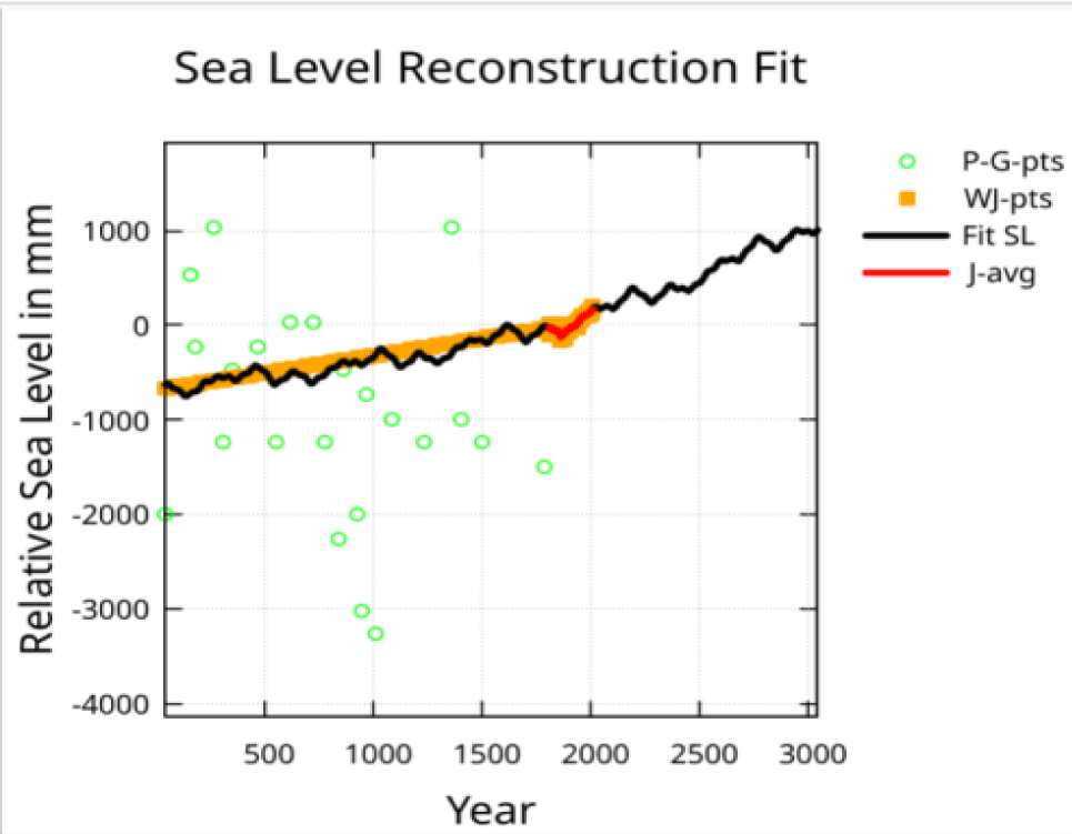Zero levels for these data sets had to be adjusted to the Jevrejeva S, et al. [1], reconstruction. This was accomplished by computing a 10-year moving average of the J-pts data (J-avg) and then shifting the W-pts data to match this average at the year 1807. The P-G-pts was shifted down 735 mm and the W-pts data was shifted down by 110 mm. This put all the data at sea-level relative to 1930. The W-pts combined with the J-pts will be referred to as the WJ-pts data. The WJ-pts constitutes the input data for the least squares fit.