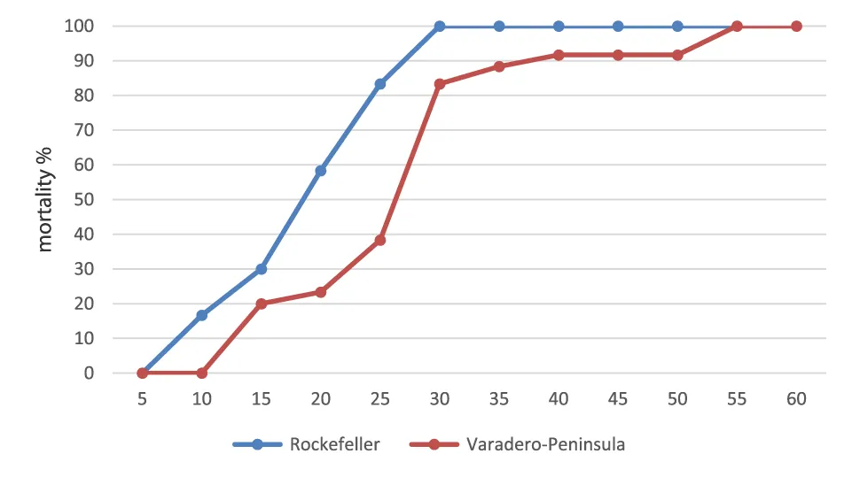 To determine susceptibility to the active ingredient cypermethrin, a fundamental requirement for defining the application of the treatment, mosquitoes from the Varadero-Peninsula population and the Rockefeller reference susceptible strain raised in the laboratory were used. The bioassays using impregnated bottles were carried out following the CDC 2010 protocol, modified by the use of 250 ml capacity glass bottles with ground-in lids. The bottles were impregnated with 1 mL of cypermethrin at 13.5 µg/mL, the dose recommended by Rodriguez MM, et al. [2]. The solutions were applied inside each bottle and rotated until the solvent, acetone, had completely evaporated. The control was impregnated with 1 ml of acetone. The bottles were covered with aluminum foil after impregnation and the lid was placed on them. After 24 hours, bioassays were performed. One control and four replicas were used for each concentration to be evaluated. For the bioassays, 15 females from one to three days old were placed in each bottle, starting with the control. For 1 hour, the individuals were observed and the number of those knocked down was confirmed every 5 minutes. After 60 minutes, those mosquitoes that were unable to fly when the bottle was gently moved or those that remained motionless at the bottom of the bottle were considered dead.