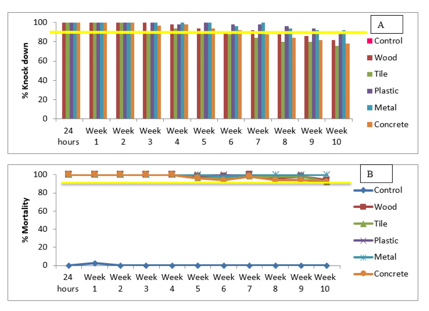 After the intervention with Aphaban 40 WP, the residual effect on different post-treatment surfaces was evaluated for 10 weeks using Ae.aegypti mosquitoes. Figure 2A shows the high percentage of mortality obtained after that time. The residuality of the tile followed by concrete and wood fluctuated from the first weeks, but remained high (> 80%) until week 6 for tile, concrete and wood until week 8. Regarding mortality, however, on all surfaces it remained above 80% until week 9. The highest mortality rates occurred in plastic and metal during the 10 weeks of the evaluation (Figure 2B). It is important to highlight that most of the water storage containers for human consumption in Cuba are made of these materials.