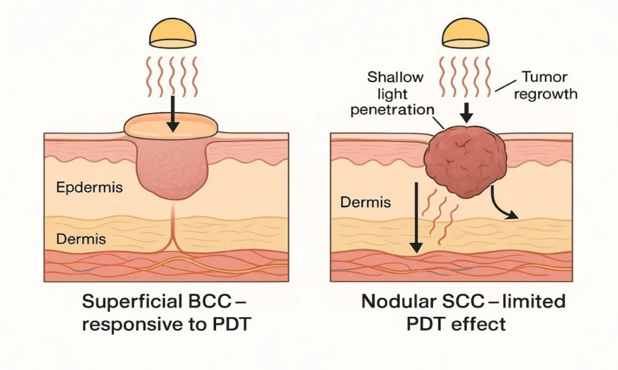 Conventional PDT as monotherapy has major restrictions, even if it offers benefits. Usually, at a depth of penetration of 2–3 mm, larger or nodular tumours react less fully. Although they are good, clinical response rates of PDT for low-risk BCC are still below those of surgery; for example, 1-year clearance rates for superficial BCC range from 80–90%, while excision yields >95%. While invasive SCC (particularly larger, poorly differentiated tumours) can be less sensitive and prone to recurrence, SCC in situ, Bowen's disease, responds well to PDT. Insufficient photosensitiser penetration, tumour hypoxia, and an immunosuppressive tumour microenvironment, allowing leftover cancer cells to survive, explain the less-than-ideal results in these situations. Therefore, there is a great justification to increase PDT with other treatments able to overcome these constraints [2] (Figure 1). Illustrates the differential response of PDT in superficial versus nodular non-melanoma skin cancers, underscoring the need for combination approaches that can address deeper or biologically resistant tumors.