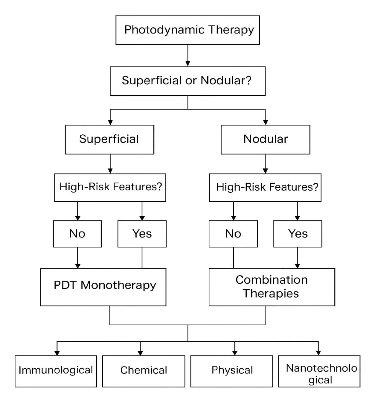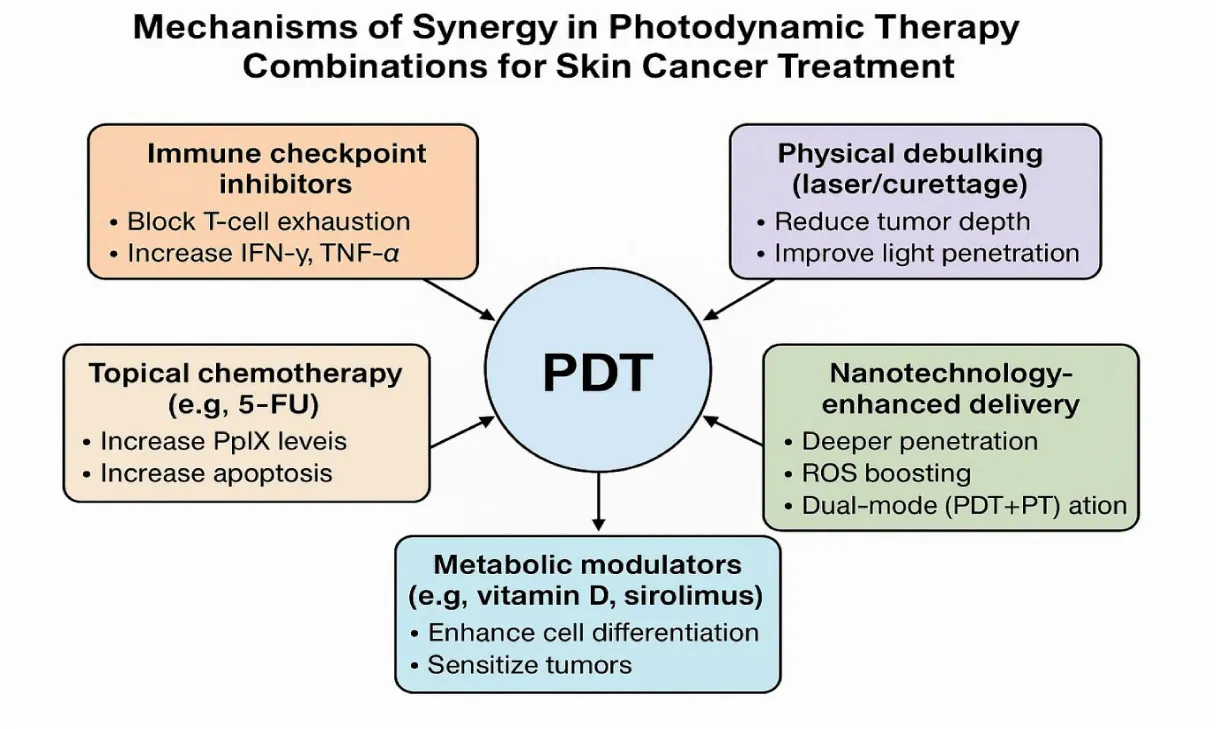 Combining PDT with different therapy techniques marks a new horizon meant to increase efficacy and widen indications. One can accomplish synergistic anti-cancer effects by combining PDT's tumour-selective cytotoxicity with the complimentary mechanisms of a second modality [4]. Over the past ten years, several other combinations have been investigated. These include: (1) PDT with immunotherapy, to bolster anti-tumor immune responses; (2) PDT with chemotherapy or other drugs, to increase tumour photosensitiser uptake or sensitivity; (3) PDT with physical debulking methods like laser ablation or curettage, to reduce tumour thickness and improve light penetration; (4) PDT with nanotechnology-based delivery systems, to overcome physical limitations and add multimodal effects; and (5) PDT with biochemical modulators of tumour metabolism or survival pathways, to render cancer cells more vulnerable to photodynamic damage. Early studies combining PDT with some of these techniques go back years, but since 2015, there has been a boom in clinical and translational research assessing their effectiveness in BCC and SCC.