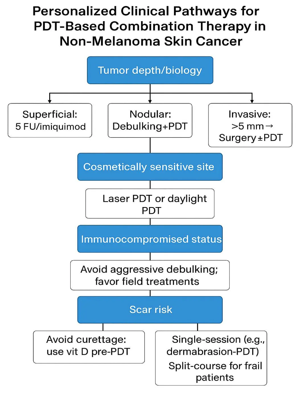 Achieving effective results with combination photodynamic therapy requires customized treatment plans that include detailed assessments of tumor properties along with patient-specific variables. Expanding therapeutic options through combinatorial strategies demands precise alignment with each patient's biological makeup and logistical circumstances to achieve optimal results. Superficial or field-based lesions show positive responses to 5-fluorouracil or imiquimod as pharmacologic adjuncts, whereas nodular tumors achieve better results through mechanical debulking techniques such as laser or curettage before PDT treatment [1,2]. Patient-focused factors, including cosmetic preferences and immune system status, determine which aggressive or conservative medical treatments are safe and acceptable. Elderly patients and those with immunosuppression should consider topical-only or fractionated treatment protocols, while younger patients who are highly motivated can choose intensive single-session approaches [25,26]. Shared decision-making considering tumor biology and other clinical and personal factors allows combination PDT to be effective and meet patient needs [22,24]. Table 2 details triage methods for personalized combination PDT treatments based on tumor characteristics, anatomical location, and patient-specific factors, including immunity status and potential scarring risk.