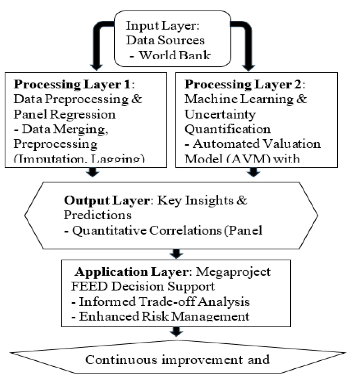 This research employs a quantitative methodology, analyzing a constructed panel dataset that merges country-level ESG indicators from the World Bank [2] and OECD house price indices [3] (c. 2009-2023). Figure 1 provides a schematic representation of the proposed framework, illustrating the key stages and analytical components involved in this study. Key analytical steps include data preprocessing (imputation checks, lagging), multicollinearity assessment (Variance Inflation Factor), panel data regression (Pooled OLS, Fixed Effects, Random Effects with cluster-robust errors), and the development of a machine learning-based Automated Valuation Model (AVM) using Random Forest with lagged predictors. Uncertainty quantification (UQ) for the AVM was performed using Conformal Prediction. The study emphasizes the decision context of the FEED stage for large-scale construction, manufacturing, and infrastructure projects. While aiming for broader applicability, the empirical analysis utilizes cross-country data, recognizing potential limitations in generalizing findings without considering specific project-level or regional data. This work focuses on establishing the conceptual and methodological foundation of the framework rather than on developing a final software tool.