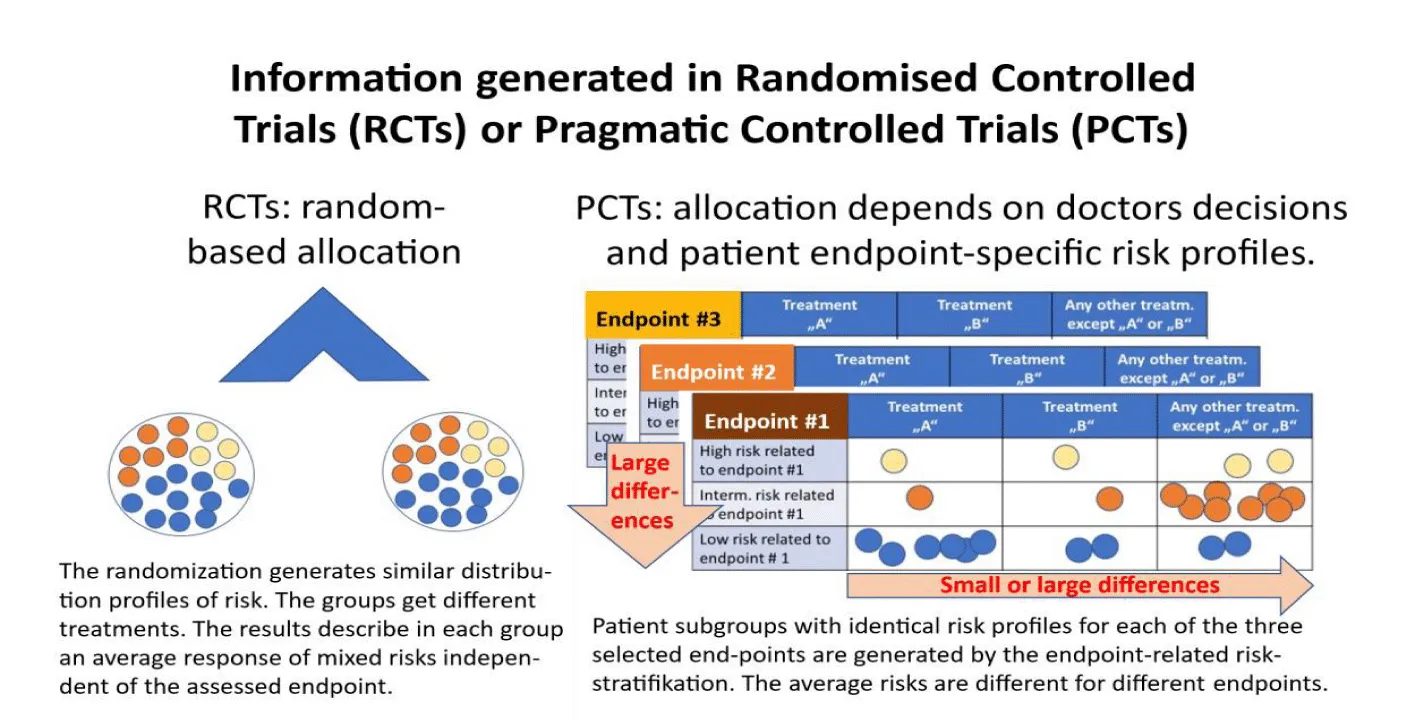 Figure 1: Results generated in experimental RCTs or in pragmatic PCTs. The PCT identifies the individual patients that received a defined treatment “A” or “B” or are listed in the group “any other treatment” when the differences in outcomes of type “A” or type “B” treatment should be compared to the range of outcomes observed in patients of the same risk group who received any other treatment. “A” and “B” may include a single type of treatment or a group of similar treatments. In addition to the treatment the ESRP were used in all patients for stratification in a high-risk (yellow) or intermediate-risk (red) or a low-risk group (blue) patient separately for each of the endpoints. The same patient may be classified to different risk groups depending on the assessed endpoint. Modified from [4,20].