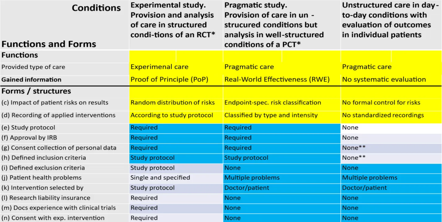 Table 2: The colors in this figure underline the differences between congruent and discordant formal (structural) criteria of the three functionally different conditions of care: Experimental care used in Randomized Controlled Trials (RCTs) and Pragmatic care used either in Pragmatic Controlled Trials (PCTs) or in the unstructured condition of day-to-day usual care without systematic evaluation of outcomes. Forms and functions that are different in the three conditions of care are indicated by a yellow background. Formal criteria that are identical in two of the three conditions of care are indicated by a blue background. IRB: Institutional Review Board. * RCT: Randomized Controlled Trial. *PCT: Pragmatic Controlled Trial. **None: Conditions defined in the doctor-patient contract.