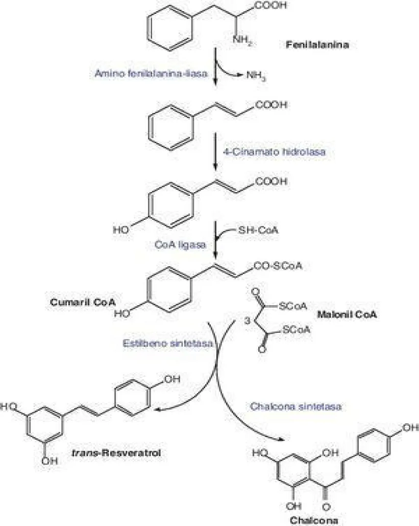 Trans - resveratrol biosynthesis pathway (Figure 3) occurs through the shikimate pathway, also known as the phenylpropanoid pathway. This compound is produced de novo by plants in plastid organelles. This pathway is initiated from phenylalanine and takes place through the condensation of a coumaryl-CoA molecule with 3 malonyl-CoA molecules. This reaction is catalyzed by resveratrol synthetase, an enzyme that belongs to the Stilbene Synthetase (STS) family. Resveratrol synthesis regularly decreases with the ripening of fruits such as grapes, due to a lower induction of STS gene expression [6]. Due to its potential beneficial properties, resveratrol is a bioactive compound that has aroused great interest not only in the field of nutrition (both due to its natural presence in certain foods and its commercialization in the form of supplements), but it is also being used in cosmetics (since it has been shown that formulations enriched with resveratrol can stimulate fibroblast proliferation or protect cells against photoaging) [7] or in the food industry for food packaging, given its antimicrobial nature [5].