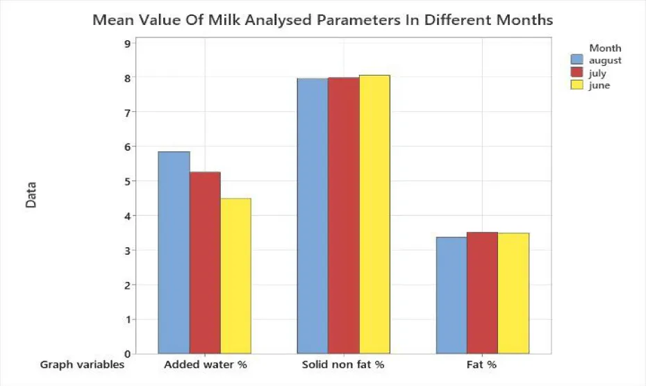 In figure 3 depicts graphically the mean of milk chemical characteristics by month. There were significant changes in June, July and August for added water %. It was found that the mean fat was significantly higher in July compared to August. It further found that the mean added water was significantly higher in August than in June, with the maximum mean solids-non-fat content in June and minimum in July.