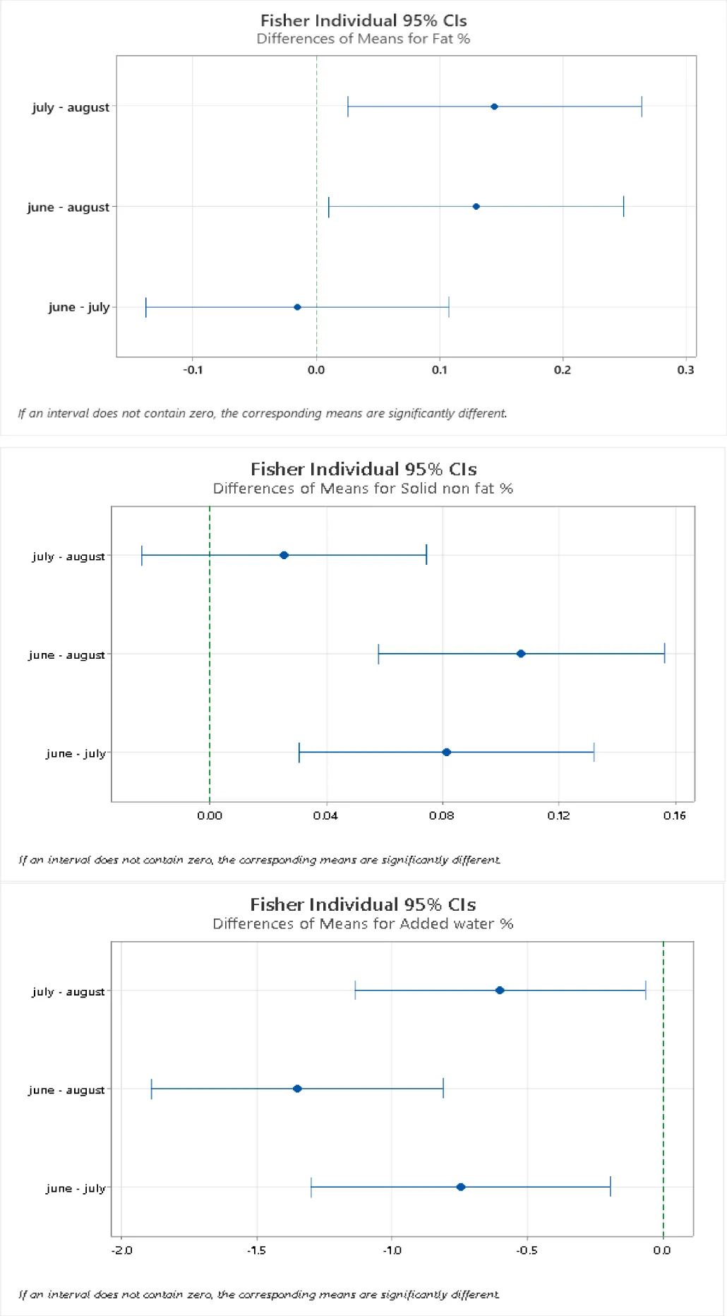 One-Way Anova analyses was used to investigate the influences of month of milk analysis on the composition of the milk. The means from the ANOVA analyses for fat, solid-non-fat and added water are shown in table 3 for level of significance α = 0.05. The means of fat, solid-non-fat and added water in the different months differ significantly from one another [15]. In figure 4 is a detailed information on the exact period when the differences in the milk content occur, using Fisher Method and 95% Confidence Interval. The differences in fat % for the corresponding analyzed samples fluctuate during the months of July-August and June-August have the greatest differences while the differences in solid-non-fat % fluctuate during the months June-July and June-August. Added water means differs significantly among all the months.