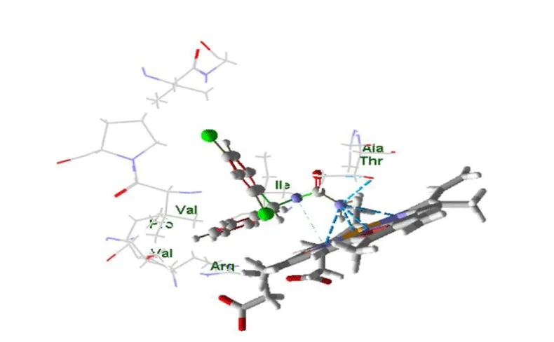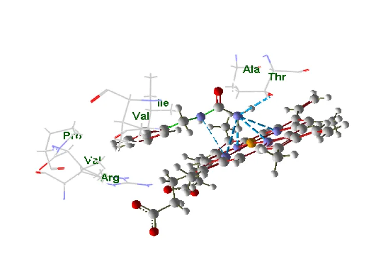 The object of this study is the human cytochrome P450 monooxygenase, which is involved in the metabolism of various endogenous substrates. The enzyme’s binding site was assessed using molecular docking to evaluate its complementarity with several low-molecular-weight compounds known to act as inducers of P450 in rats. A key component of the binding site is the heme moiety (cofactor), which contains a chelated iron ion (Figures 1,2).
