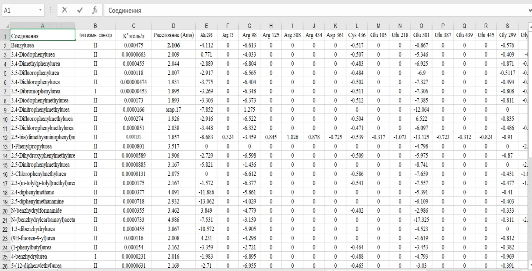For each of the 46 inducers investigated, the best docking position was selected for further analysis. The data were ordered according to the distance between ligand and receptor, partial values of the evaluation function corresponding to amino acid residues, and compound class (type of binding to cytochrome according to the pattern of spectral changes) figures 3-7.
