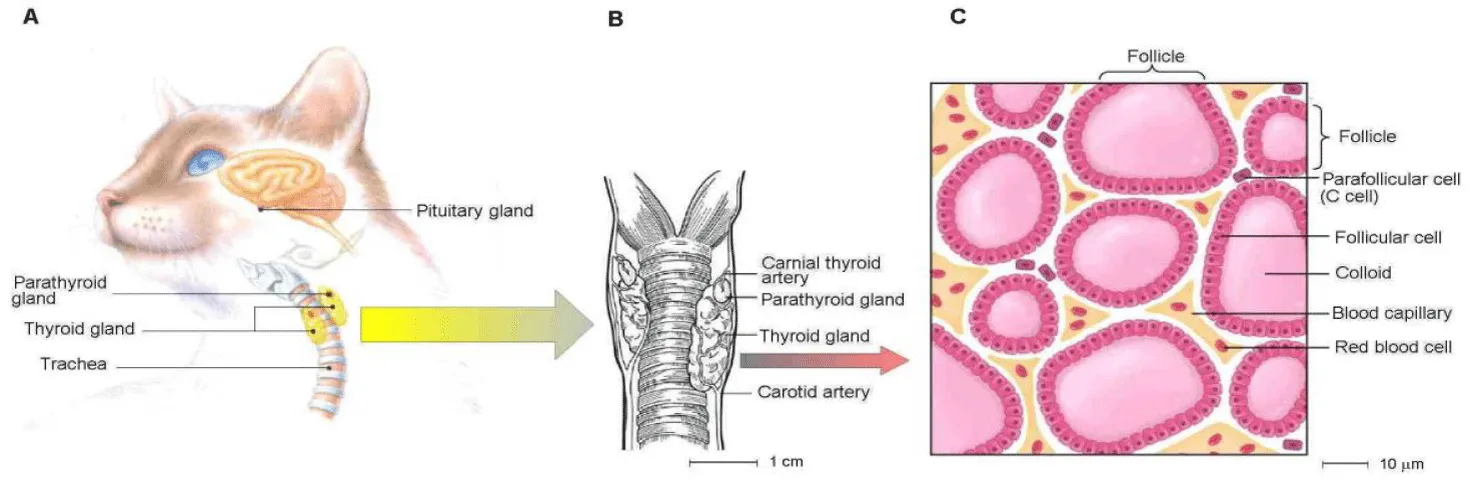 Each thyroid tissue was sampled from a diagnosed cat by thyroidectomy as a curative treatment, and the tissue sample was fixed with 10% neutral-buffered formalin immediately after resection. The fixed sample was put in an airtight plastic container and sent to a pathology laboratory. After that, sections of the mass and grossly normal small intestines in close proximity to the mass were prepared. The tissues were stained with hematoxylin and eosin to examine a tissue portion under a microscope to see the structure and appearance of cells.